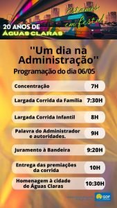 Dia 06 de maio de 2023 haverá programação de aniversário de Águas Claras em comemoração aos seus 20 anos de história. Dessa forma, nessa data especial algumas atividades serão proporcionadas à população com a realização da Administração da cidade. Além disso, terá uma excepcional homenagem a nossa região jovem que acolhe diariamente moradores que aqui vivem. Vale ressaltar que os eventos acontecerão ou terão como início na Administração de Águas Claras-DF e toda a comunidade está convidada a participar