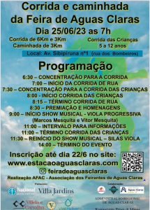 No dia 25/06/2023 acontecerá uma corrida para celebrar 21 anos da Feira de Águas Claras. Desse modo, a feira é um local com variedades de frutas e verduras, que atende os moradores de nossa Região Administrativa. Além disso, é um local para experimentar um pastel com caldo de cana originalmente de uma feira! Dessa forma, para comemorar essa iguaria em nossa cidade, acontecerá dia 25/06 uma corrida e caminhada para crianças e adultos